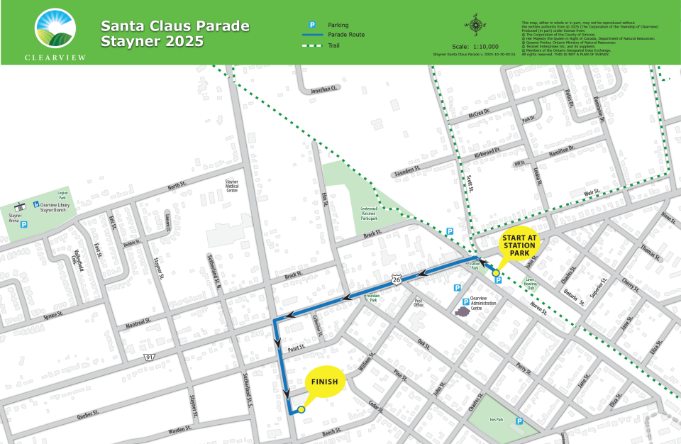 Starting at Station Park travelling West along Highway 26 to Airport Road, the South on Airport Road, finishing at the old Foodland.